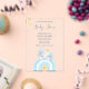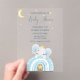 Announce the joy of a little one on the way with our adorable Baby Elephant Baby Shower Invitation. Against a soothing light blue background, a charming baby elephant stands atop a rainbow, accompanied by a crescent moon and stars, creating a whimsical and heartwarming scene. The dusty blue text adds a touch of sweetness to this delightful invitation. This carefully crafted design captures the essence of innocence and anticipation, making it the perfect choice for celebrating the upcoming arrival of your bundle of joy. Invite your loved ones to share in the excitement with this endearing Baby Elephant Baby Shower Invitation, a precious introduction to a joyous occasion.