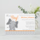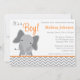 A modern grey and orange elephant themed baby shower invitation. Perfect for a little boy baby shower.