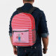 An adorable pink and red backpack for kids featuring a cartoon elephant , a stripe pattern and some tiny hearts on the sides . Personalize it with the child's initials .
