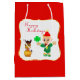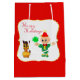 Cute elf and its puppy dog on red background Gift Bag. Happy Holidays text can be personalized.