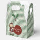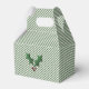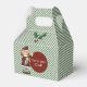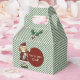 Green and white striped Christmas gable shaped small favour gift box, with colourful graphics of a little girl elf and sprigs of holly. A red circular text area, on the front of the box, has custom white text ready to personalize. Great little holiday box for party favours, small gifts, and like displayed, as a fun You've been elfed box.