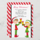 This is an adorable Christmas party card to send to family & friends during this magical holiday season. It has a red and white striped background. Then there's a black thin border with a white centre. There's this cute girl elf holding up presents. Next to her is this a cute boy elf doing the same thing. The elves are dressed in red and green wearing santa hats. Personalize with a greeting next to them. Check out the many other designs and products we have for Christmas . © JW Illustrations