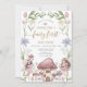 A magical fairy themed pink invitation for a little girl's 1st birthday party, featuring an enchanted fairy garden setting with florals, and mushrooms. Available in print, as a digital download, or both.