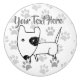 Cute little English Bull Terrier, white with black eye patch, over a background of grayscale paw prints...classical!