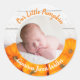 This beautiful, modern Thanksgiving newborn photo sticker features a photograph of your sweet new baby under the words Our Little Pumpkin in orange. This pretty autumn photograph with trendy white wood behind the patch of pumpkins is an elegant baby design for a Halloween or Thanksgiving birth.