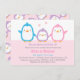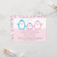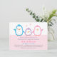 A little one is on the way to make it a family of three! Invite friends and family to celebrate this wonderful occasion with this cute and simple baby shower invitation! It features a happy penguin family of three with egg like proportions, daddy, baby and mommy in blue, purple and pink respectively. The reverse is pattern made using the baby penguins that are holding wings. Purple baby penguin suggests the arrival of baby girl. Great for babies arriving in the winter or December period. Personalise with your baby shower details.