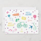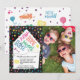 Adorable moving announcement invitation cards with family photo on the front opposite a quirky, fun little house with the new address details inside and the hand-lettered "New Home Sweet Home" on top. On the back is a cute pattern illustration of a bike, car, key, air balloon and "We've moved!" text. All in fun rainbow colours perfect for families with kids moving to a new house!