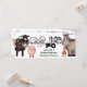 This cute birthday party invitation features funny farm animals; a cow, pig, horse and rooster with a black and white farm scene background.
