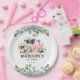 Cute kids farmyard birthday party plates featuring a simple white background, elegant eucalyptus foliage, adorable watercolor farm animals including a cow, pig, sheep, dog, chicken, rabbit, duck & a rooster, and a text template that is easy to customize.
