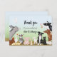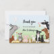 Say thank you for a gift for a baby shower, baptism, christening, naming ceremony or child's birthday party with this cute farm animals friends card featuring a donkey, a goose, a hen and her chicks, a baby goat, a piglet, a rabbit, two lambs, a border collie, a black cat and a cow and her calf.