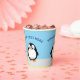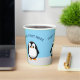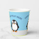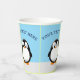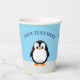 Cartoon style penguin. Blue sky in the background. Custom decorative paper cups for party decor. Edit text to customize. Gift idea for penguin lovers.