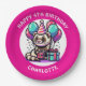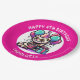 Cute personalized birthday party paper plates for a little girl. Adorable with a cute cartoon ferret with birthday hat, gift and balloons in pink, teal and purple colours.