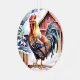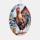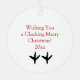 Cute Christmas ornament with a watercolor style chicken standing by a rustic wood fence in front of a barn.