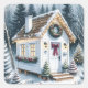 Personalized Christmas stickers. Cute little white festive tiny house on a snowy winter day decorated in cute Christmas garland, wreaths and lights.