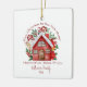 A Christmas tree holiday ornament to celebrate the first Christmas in a new home. On the front side is a cute little red house and a place to personalize the house's street number on its door. Fantasy Christmas flora and candy canes surround the house. Add a new address and the family's name and year in a trendy modern script typeface. On the reverse side, add a family photo of your choice. Personalize all using the template fields provided. Message me if you need assistance with sizing. Great keepsake gift for new home owners!