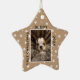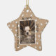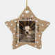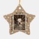 Cute First Christmas Puppy Photo Ceramic Ornament. The background is beige with white stars. Personalize the ornament with your dog`s photo, name and year of birth - insert your favourite puppy photo. You can use this custom ornament for any pet. A great holiday keepsake for you or a gift for your family and friends.