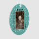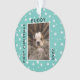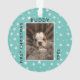Cute First Christmas Puppy Photo Ceramic Ornament. The background is turquoise with white stars. Personalize the ornament with your dog`s photo, name and year of birth - insert your favourite puppy photo. You can use this custom ornament for any pet. A great holiday keepsake for you or a gift for your family and friends.