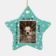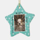 Cute First Christmas Puppy Photo Ceramic Ornament. The background is turquoise with white stars. Personalize the ornament with your dog`s photo, name and year of birth - insert your favourite puppy photo. You can use this custom ornament for any pet. A great holiday keepsake for you or a gift for your family and friends.