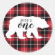 Cute Flannel Plaid Pattern Bear 1st Birthday Party Classic Round Sticker
