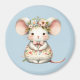 This charming illustration features an adorable white and grey mouse dressed in a vintage-style floral dress, complete with a delicate lace hem and a sweet pink bow. With her oversized ears blushing with soft pink tones and a cheerful flower crown nestled between green leaves, she exudes a delightful woodland innocence. The pastel colour palette, including creamy neutrals, soft blues, and rosy pinks, gives the design a gentle, nostalgic warmth perfect for cottagecore and nursery themes. Her joyful expression and dainty details create a whimsical, storybook vibe that’s ideal for adding a touch of playfulness to seasonal decor, baby showers, or children’s spaces. This piece beautifully blends soft watercolor textures with a clean illustrative finish, making it visually inviting and emotionally comforting. AI generated artwork.