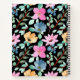 The design features soft pastel flowers in pink, yellow, and blue tones with green leaves, all beautifully arranged on a bold black background.
