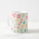 A delicate and feminine seamless pattern featuring a variety of small flowers in soft pastel hues of pink, blue, and yellow, interspersed with simple green leaves. The pattern is set against a clean white background, creating a cheerful and airy aesthetic.