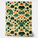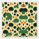 A whimsical pattern featuring adorable green forest animals surrounded by stylized trees and geometric shapes. The soft yellow background complements the dark green and orange tones, creating a playful, nature-inspired design perfect for kids' products and decor.