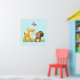 A poster with a cute illustration featuring a baby deer and a little squirrel holding an acorn and a butterfly flying above their heads. These adorable woodland creatures on standing on some grass with some whimsical mushrooms by their feet. Light blue background.