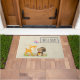 Welcome door mat with a cute illustration featuring a baby deer and a little squirrel holding an acorn and a butterfly flying above their heads. These adorable woodland creatures on standing on some grass with some whimsical mushrooms by their feet. Sandy brown background.