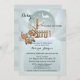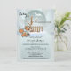 Lovely gender neutral baby shower invitation featuring a winter wonderland scene with a cute fox and snow covered tree on a pastel green blue background design.