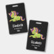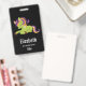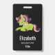 Personalized name badge with an image of a Frankenstein style unicorn. Purple and green colours. Spooky cute.