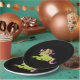 Paper plates with an image of a Frankenstein unicorn. Purple and green colours. Spooky cute.