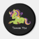 A thank you magnet with an image of a Frankenstein style unicorn. Purple and green colours. Spooky cute.