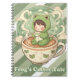 A cute boy in a frog suit sitting in a coffee cup reading a book. Perfect gift for coffee and book lovers alike.