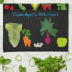 A bunch of happy cartoon fruits and vegetables to cheer up your kitchen. The background colour, text style and colour can be changed by selecting to customize the design. Original vector design by Night Owl's Menagerie, 2017.
