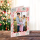 This fun holiday photo card features a vertical photo with whimsical hand-drawn Christmas illustrations in red and dark green over a light pink background. Inside the card, the modern typography greeting says "Happiest Holidays". Customize this design further by adding another photo and/or additional text to the inside. The look is fun, modern, and festive! DESIGN TIP: Background and text colours are customizable by using the editor tool.