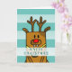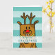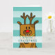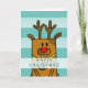 Cute Funny Deer Turquoise Green Happy Christmas Card. Drawing of a deer with red nose on background with stripes. Personalize the card with your message inside or erase it.