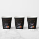 Cute Funny Black Kitten Halloween Paper Cups. A fun and spooky trick-or-treat trivet featuring a wide-eyed, cute yet scary kitten wearing a sheer ghost costume! The playful kitten's eerie expression and whimsical outfit add a touch of Halloween charm. Add your own text or use "Happy Halloween".