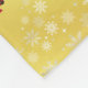Cute, funny, and also elegant custom-name Christmas fleece blanket for kids with Santa in his red costume (holding a candy cane) and his favourite reindeer, Rudolph, behind him; with the greeting "Merry Christmas!" in cursive script / calligraphy and with very cute Christmas trees with baubles. With a personalized name. The design includes silver and off-white snowflakes and stars for a festive holiday mood. On a partly golden background.