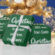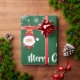 Cute, funny, and also elegant Christmas giftwrap for kids with the words "Merry Christmas" in stylish typography, a personalized dedication now reading "To Amber / with love / from Santa," snowflakes, Santa in his red costume (holding a candy cane) and his favourite reindeer, Rudolph, behind him, and a Xmas tree. On a green background with snowflakes.