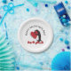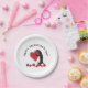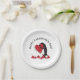 The product design features a penguin holding a big red heart. This charming animal illustration makes cute modern and unique paper plates with personalized text - Party supply ideas for Valentine’s Day - Happy Valentine's Day!