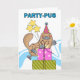 Partypus! Cute and funny birthday greeting card with an illustration of a platypus wrapping birthday presents and holding star balloons. Cute platypus pun message written inside. Art, image, and verse copyright © Shoaff Ballanger Studios, 2025.