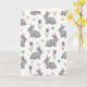 Designed with a repeating pattern on a white background, this card features many gray long-eared rabbits 🐰 shown in calm seated poses, with soft pink inner ears and noses and small dark eyes that seem to glance gently toward one another. Light shading under each rabbit adds a bit of depth, like they’re resting together on a quiet spring day. Between them, small purple flowers with slender green stems appear like little bouquets, adding a sweet, friendly touch 🌷. Scattered around the pattern are round polka dots in pastel pink, mint green, lavender, and teal, drifting between the animals and blooms. The overall look feels tender and companionable, as if the rabbits are sharing a soft, unspoken moment side by side. A short Easter greeting sits near the top in a soft purple color, centered and easy to read against the white space. The flowers show simple petal shapes with thin green stems tucked between the rabbits and pastel dots.