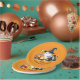Create unique custom camping Halloween orange paper plates with the "Happy Halloween!" saying and a cute ghost in a witch hat roasting marshmallows for s'mores at the campfire. The template makes it easy to type the year (2024, 2025, 2026, and beyond) for a camping theme non-spooky party or mailing seals.