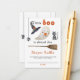 Featuring cute watercolor of baby ghost and Halloween aesthetics. A little boo is almost due! Halloween themed baby shower with watercolor ghost, black cat, witch's hat, magic mop ( broomstick ), spider hanging from a web. The little ghost is eating a lollipop.