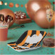 Add some festive fun to your Halloween party with these paper plates featuring a cute cartoon ghost who says "boo!". With a bright and modern orange and black stripe background, these plates are sure to be a hit at your gathering. Great for both kid and adult Halloween parties, or even fall/October birthday events. May be personalized with your own text, if you wish.