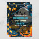 Get your guests excited for a night of Halloween fun with this modern and playful costume party invitation. The front design features a dark blue background, setting a magical and slightly spooky tone. At the centre of the design is a super cute ghost wearing a witch's hat, bringing a dash of charm to the classic Halloween look. A happy jack-o' lantern and a jack-o' lantern cauldron add to the festive atmosphere, while tons of twinkling stars scattered across the background give the invitation a whimsical, enchanting vibe.
