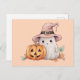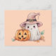 Step into the enchanting world of Halloween with our delightful Halloween postcard! Embrace the spirit of the season with its charming design featuring a super cute ghost wearing a pink witches hat, standing next to a classic jack-o'-lantern. Against a vibrant orange background, this postcard captures the essence of Halloween fun.