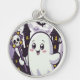 A charming and whimsical poster featuring a cute ghost holding a spooky magic wand adorned with a skull. The background showcases a haunted castle with towering turrets and bats flying around, all enveloped in a soft purple hue. This delightful blend of cute and spooky elements makes it a perfect addition to Halloween decor or to bring a playful mystery to any space.