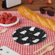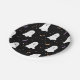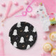 Cute ghosts Halloween paper plate in black background with scattered orange bats, purple moons and stars. Perfect for Halloween themed party decoration.